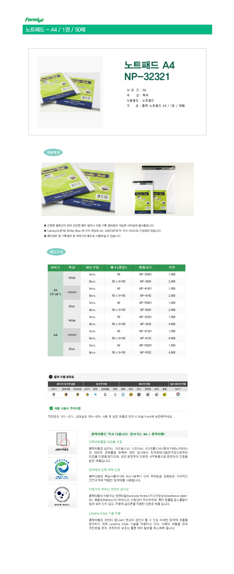 폼텍패드 NP-32321 A4 (흰색,50매,1권)