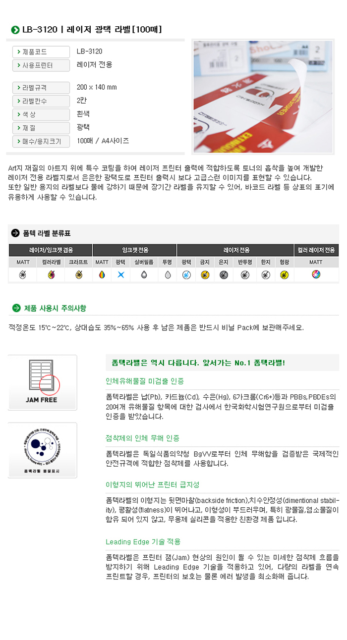 폼텍 레이저용 광택 라벨 LB-3120 (2칸,100매)