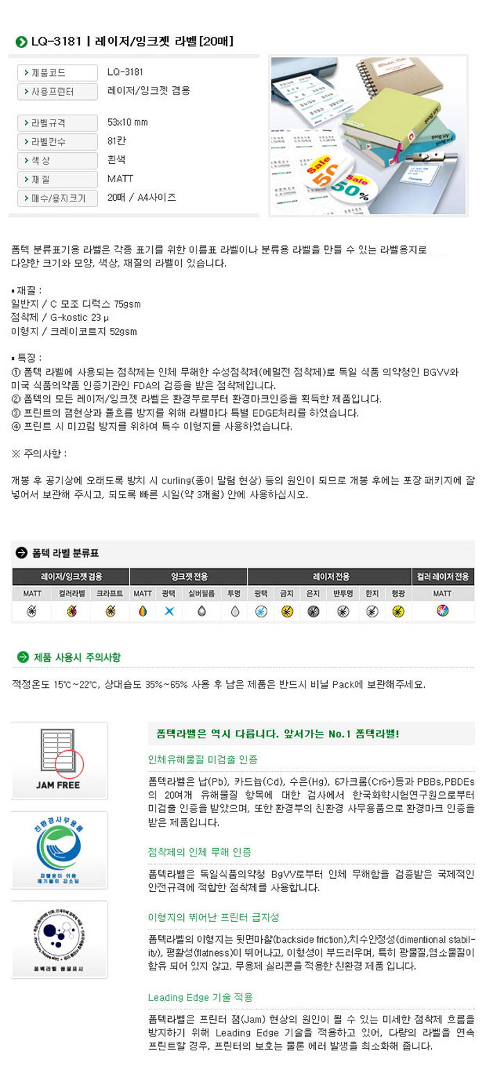 폼텍 분류표기용 라벨 LQ-3181 (81칸,20매)