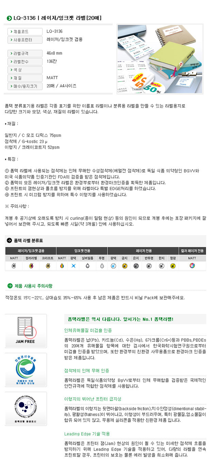 폼텍 분류표기용 라벨 LQ-3136 (136칸,20매)