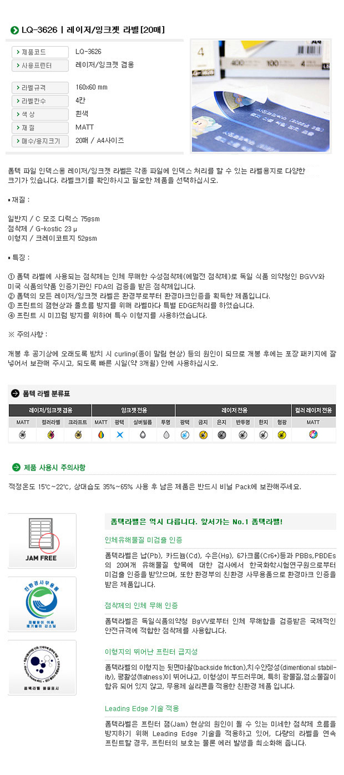 폼텍 화일인덱스용 라벨 LQ-3626 (4칸,20매)
