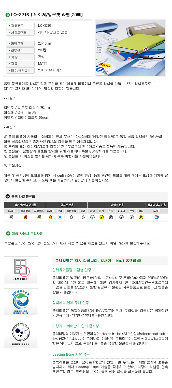 폼텍 레이저 잉크젯라벨 LQ-3216 (216칸/20매)