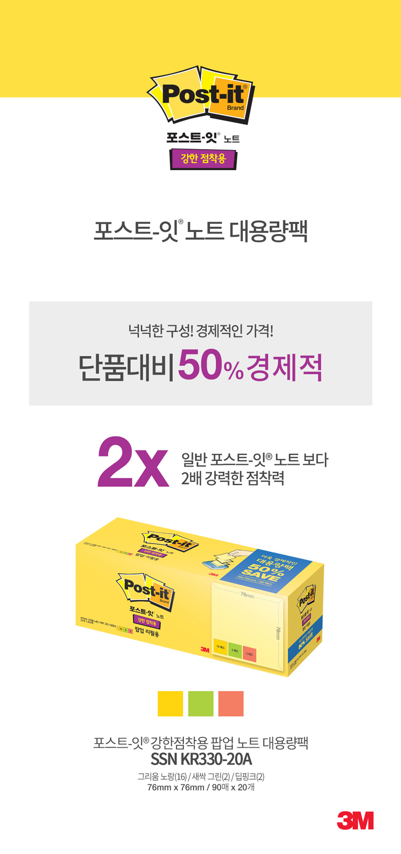 3M 포스트-잇® 강한점착용 팝업리필용 대용량팩 KR330-20A
