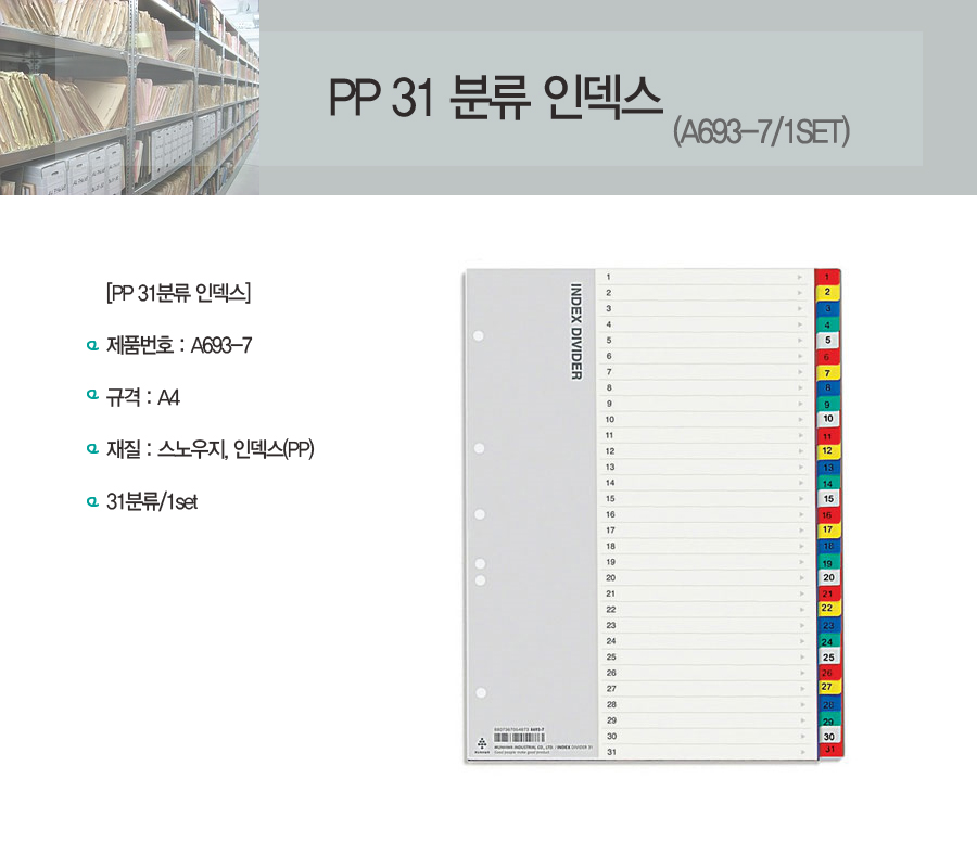 | 품명 및 모델명 | 문화 화일인덱스 A4 (31분류,PP) A693-7 |