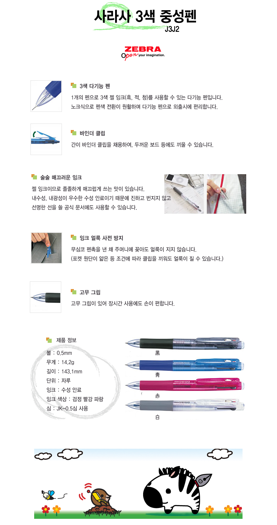 | 품명 및 모델명 | 제브라 사라사 3색 볼펜 0.5 (흑+청+적,흑색바디) J3J2-BK |