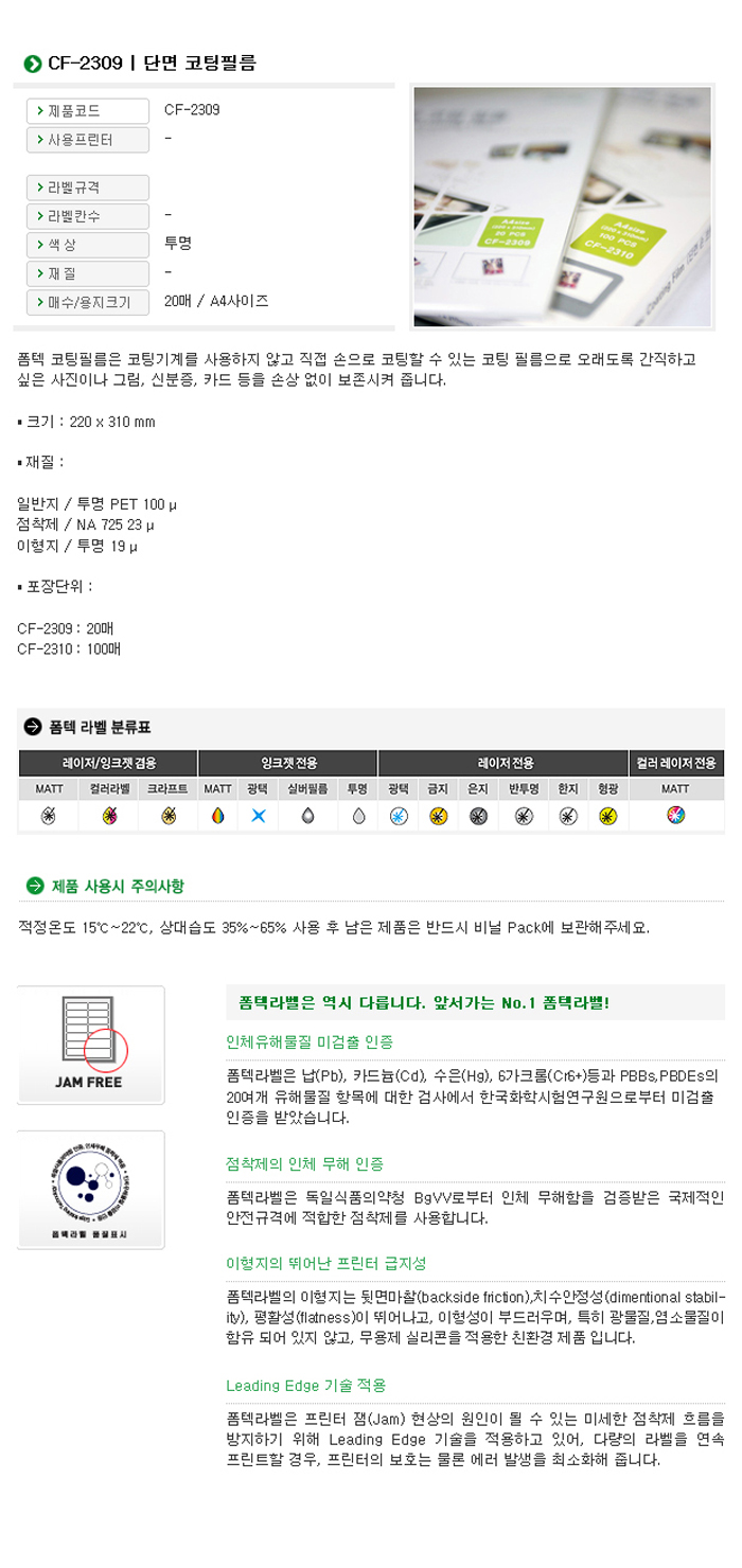 폼텍 손코팅필름 100mic CF-2309 A4 (220*310mm,20매)