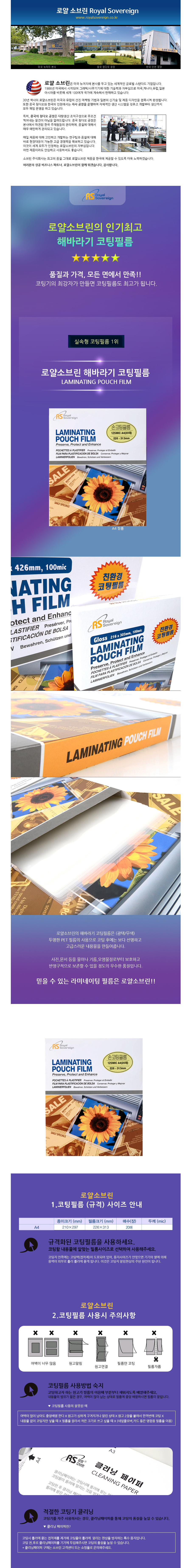 | 품명 및 모델명 | 로얄소브린 손코팅필름 125mic A4 (226*313mm,20매) |