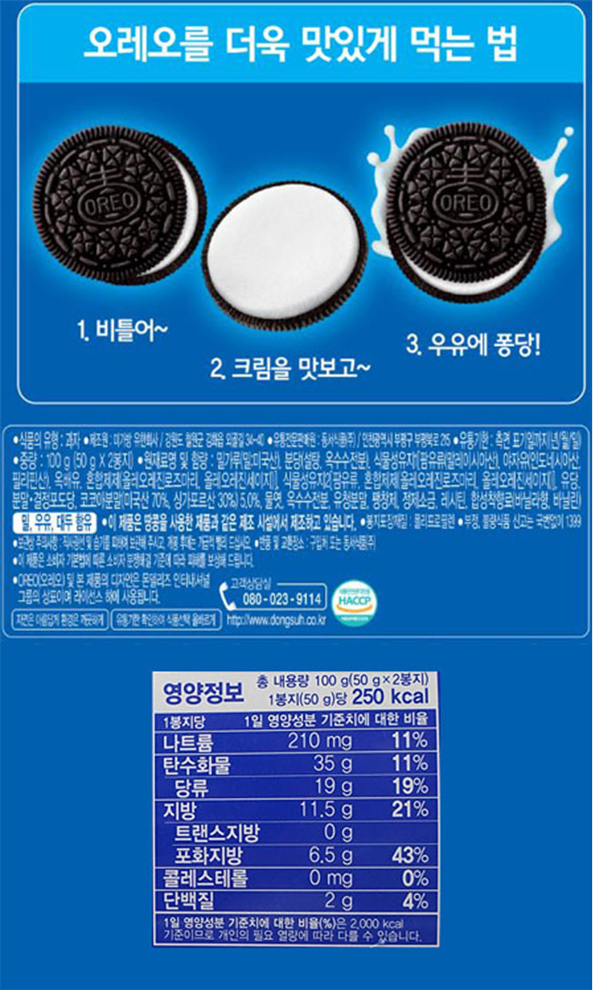 | 원재료명 및 함량 | 밀가루(밀/미국산),분당(설탕곡수수전분),식물성유지, 야자유,옥배유,혼합제제,코코아분말,포도당,물엿,옥수수전분,유청분말,코코아매스,산도조절제,정제소금 |