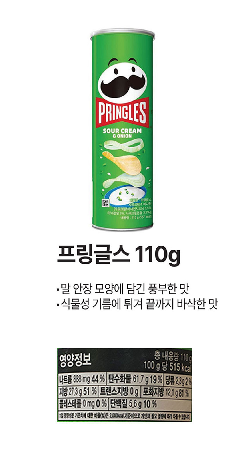 | 원재료명 및 함량 | 말린감자, 식물성유지, 밀전분, 옥수수가루, 구연산 양파맛시즈닝유청(우유),효모추출물,천연착향료, L글루타민산나트륨(향미증진제),크림(우유),젖산합성착향료(양파향),우유,버터(우유),젖산칼슘,양파변성옥수수전분, 초산, 사과산, 파슬리,쌀가루,말토텍스트린,유화제,정 |