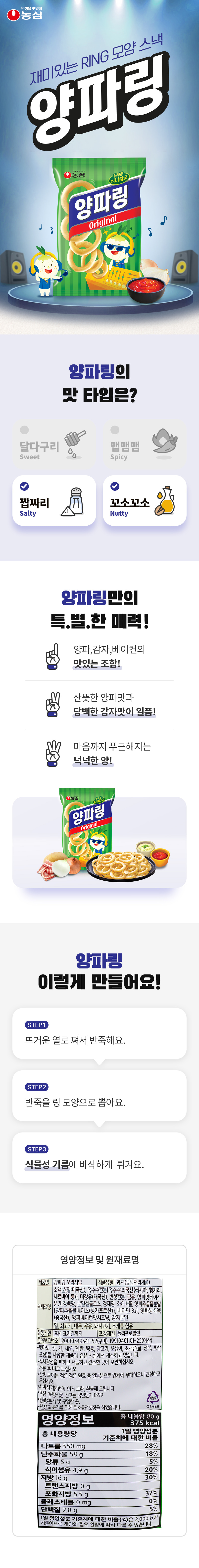 | 원재료명 및 함량 | 소맥분(밀;미국산), 미강유(태국산), 소맥전분 , 양파맛베이스분말(양파베이스분말,, 정백당 , 분말셀룰로오스 , 소맥전분 , 정제염), 혼합제제(전분,덱스트린), 팜유 , 양파베이컨맛시즈닝 , 조제감자분말 , 탈지대두(대두), 유당(우유), 비타민B2 |