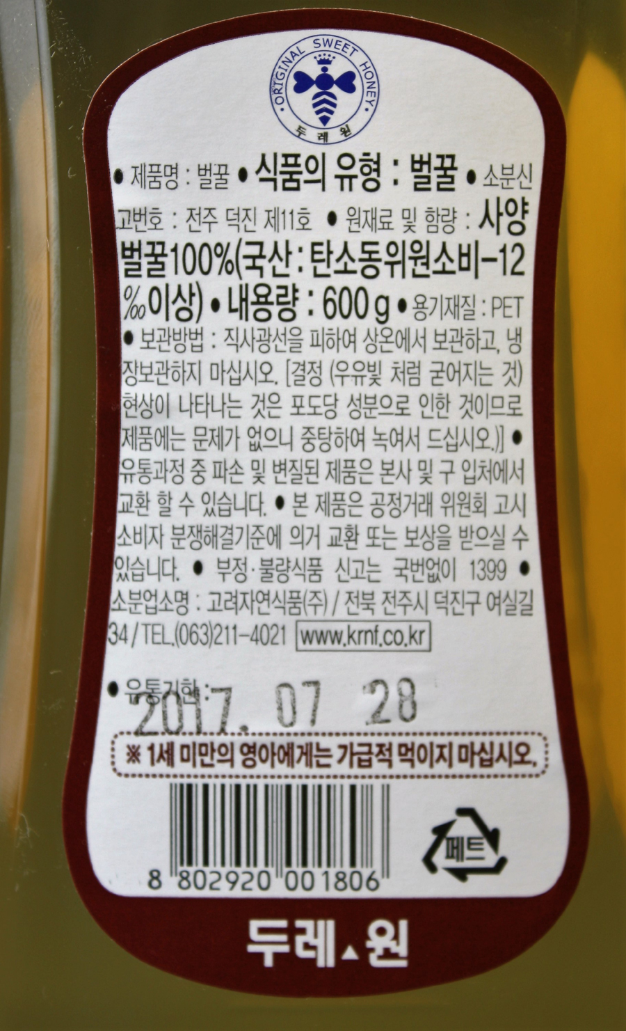 | 원재료명 및 함량 | 벌꿀(국내산) |