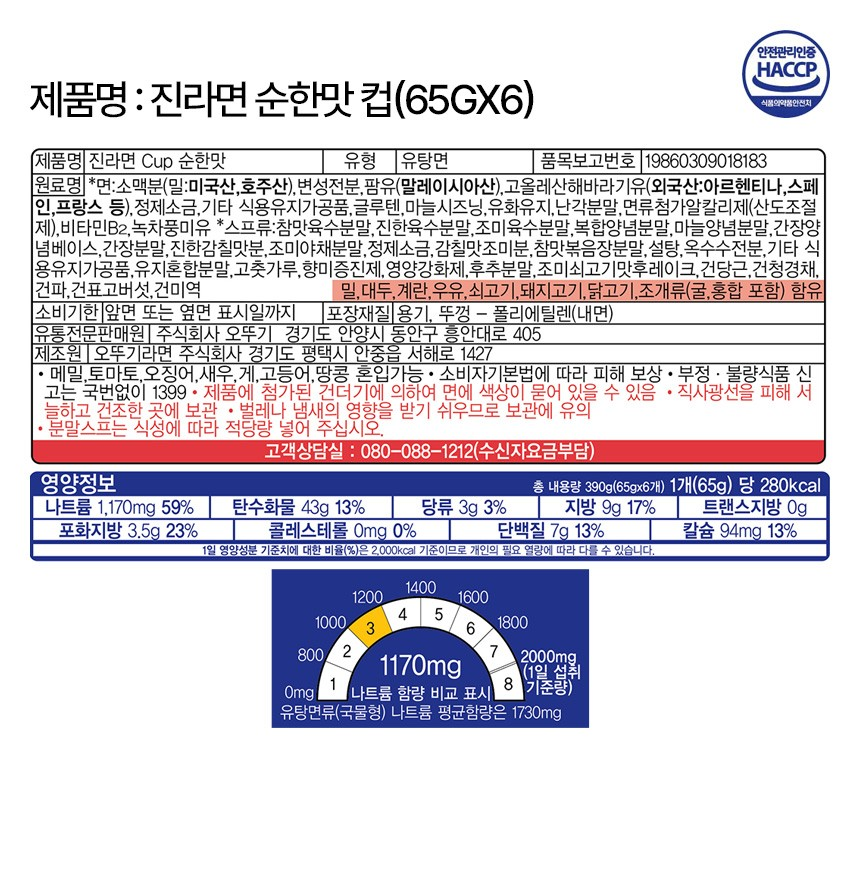 오뚜기 진라면 컵 순한맛 (65g*6개입/팩)  ※ 패키지상품