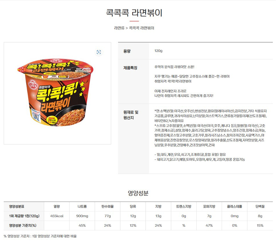 | 원재료명 및 함량 | 면-소맥분(미국산,호주산), 팜유(말레이시아산),변형전분, 감자전분, 양파추출물, 유화유지, 글루텐,난간분말, 면류첨가알칼리제, d-토코페롤, 스프류-고추장,정백당, 프락토올리고당, 양파, 정제수, 혼합간장, 마늘, 사골추출물, 정제염, 향미증진제, 지미맛분말, 고추농축 |