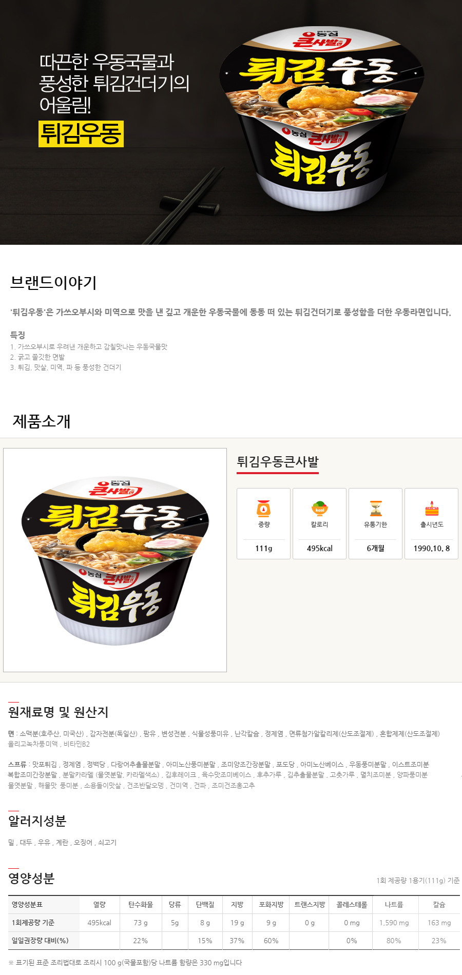 | 영양성분 | 1회제공량기준(일일권장량 대비%) 열량(kcal) 480kcal 탄수화물(g) 72g 22% 당류(g) 5g 단백질(g) 8g 13% 지방(g) 18g 36% 포화지방(g) 9g 60% 트랜스지방(g) 0g 콜레스테롤(g) 0mg 0% 나트륨(mg) 1,780mg 89% 칼슘(mg) 158mg 23% 기타 |