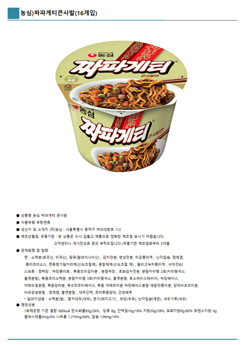 | 생산자 및 소재지 (수입자) | (주)농심, 서울시 동작구 신대방동 370-1 |