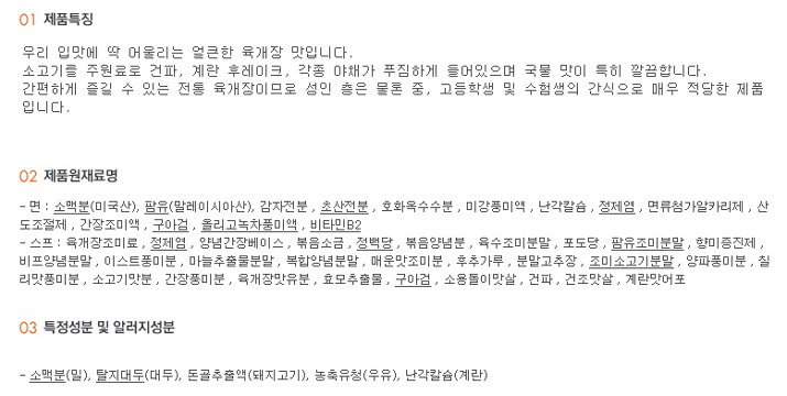 | 원재료명 및 함량 | *면 : 소맥분(호주산, 미국산), 팜유(말레이시아산), 감자전분 , 변성전분 , 호화옥수수분 , 미강풍미액 , 난각칼슘 , 정제염 , 면류첨가알카리제(산도조절제), 혼합제제(산도조절제), 간장조미액 , 구아검 , 올리고녹차풍미액 , 비타민B2 *스프 : 육개장조미료 , 정제염 , |