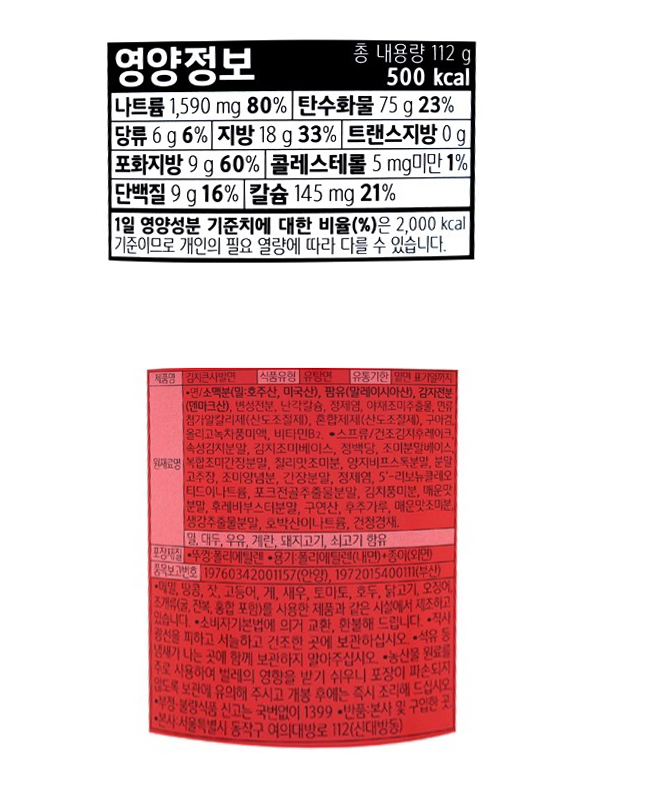 | 원재료명 및 함량 | *면 : 소맥분(호주산, 미국산), 팜유(말레이시아산), 감자전분 , 변성전분 , 미강풍미액 , 난각칼슘 , 정제염 , 야채조미추출물 , 면류첨가알칼리제(산도조절제), 혼합제제(산도조절제), 올리고녹차풍미액 , 비타민B2 *스프 : 건조김치후레이크 , 김치양념조미분말 , 정제염 |