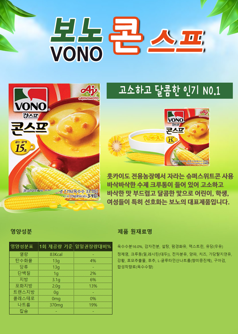 | 원재료명 및 함량 | 옥수수분16.0%,감자전분,설탕,팜경화유,덱스트린,유당(우유),정제염,크루통(밀,레시틴(대두),전지분유,양파,치즈,가당탈지연유,강황,효모추출물,후추,L-글루타민산나트륨(향미증진제) 구아검, 합성착향료(옥수수향) |
