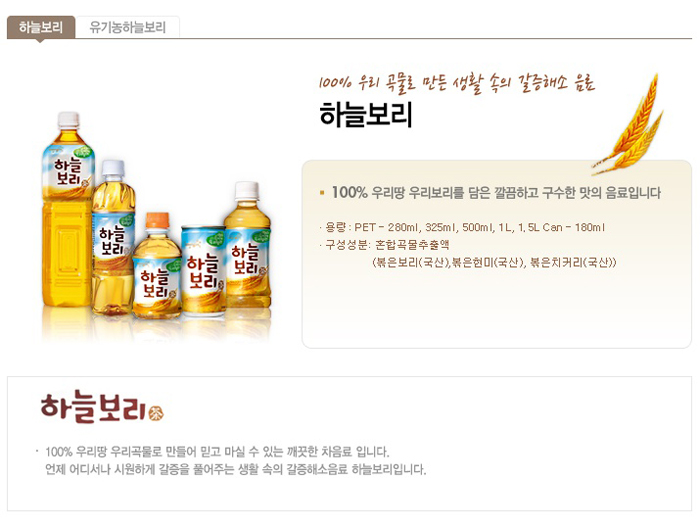 | 원재료명 및 함량 | 혼합곡물추출액 45 %(고형분 0.2 %이상, 혼합곡물추출액 성분 : 볶은보리(국산) 4 %, 볶은옥수수(국산), 볶은현미(국산), 볶은치커리(국산)), 정제수, 보리추출농축액 0.15 %(고형분15 %이상, 국산), 비타민C, 탄산수소나트륨 |