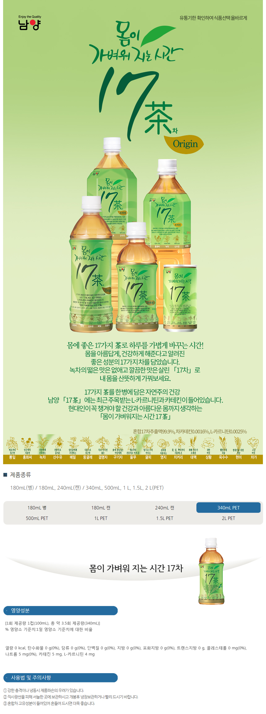 | 원재료명 및 함량 | 혼합17차추출액99.9%(고형분0.2%),L-카르니틴,차카테킨, 비타민C,식물혼합농축액(N,Y),탄산수소나트륨 대맥(국산)23%,율무(국산)16%,메밀,현미,옥수수,둥굴레,결명자,영지버섯,녹차,치커리 |