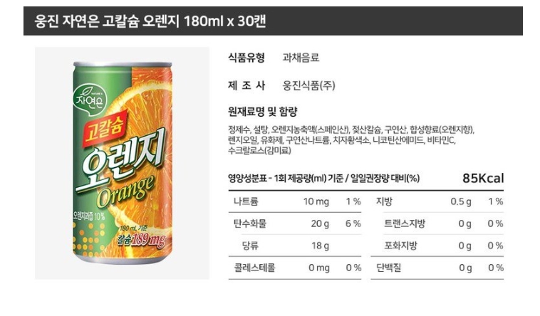 | 원재료명 및 함량 | 오렌지농축액(오렌지과즙으로 25 %, 그리스산), 정제수, 백설탕, 젖산칼슘, 구연산, 합성착향료(오렌지향), 오렌지오일, 유화제, 구연산삼나트륨, 니코틴산아미드, 비타민C, 수크랄로스(합성감미료) |