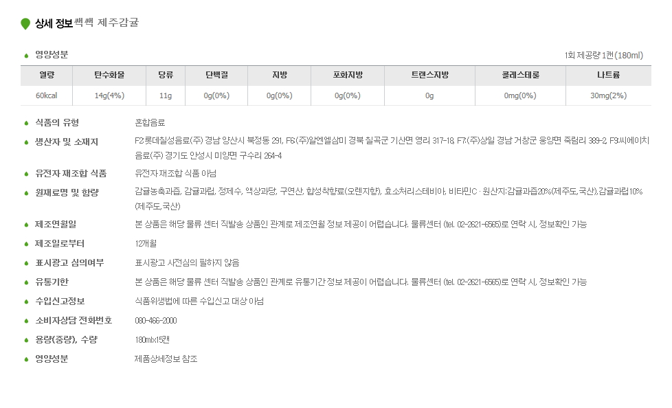 롯데 쌕쌕 제주감귤 (180ml*15캔/BOX)