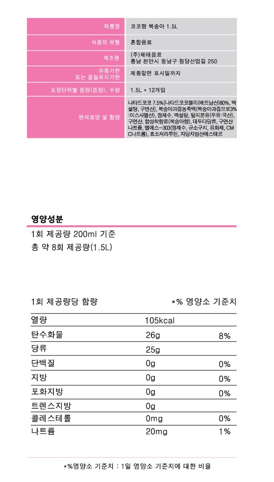 해태htb 코코팜 탱글탱글 복숭아 (1.5L PET)