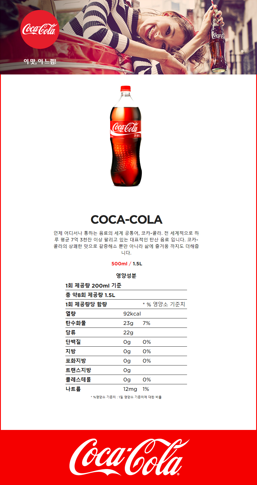 | 원재료명 및 함량 | 정제수, 액상과당, 백설탕, 탄산가스, 카라멜색소, 인산, 천연착향료 |