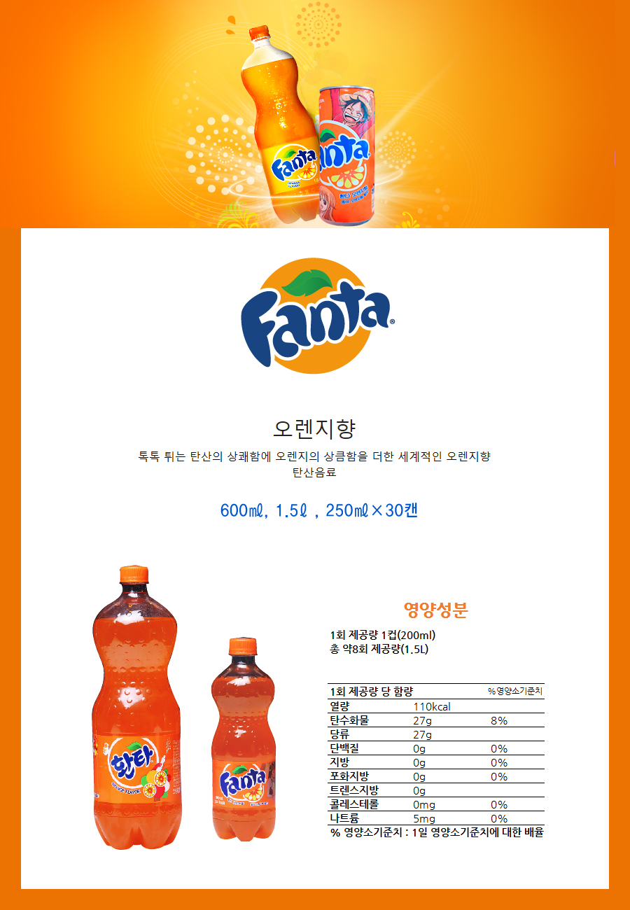 | 원재료명 및 함량 | 정제수, 액상과당, 탄산가스, 구연산, 아라비아검, 합성착향료(오렌지향), 자당지방산에스테르, 합성책색료(식용색소황색제5호),프로필렌글리콜,L-아스코르빈산,로진 |