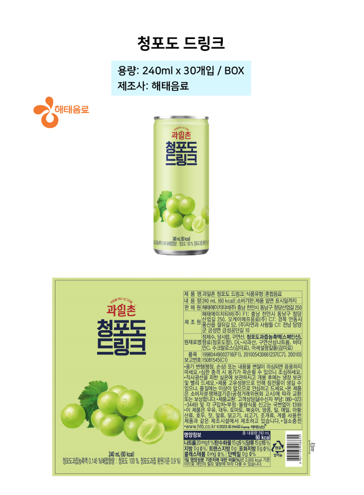 해태)과일촌 청포도 드링크(240㎖/30개입)