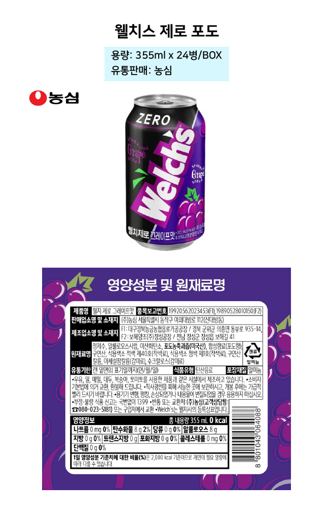 농심)웰치스 포도 제로 (355㎖/24개입)