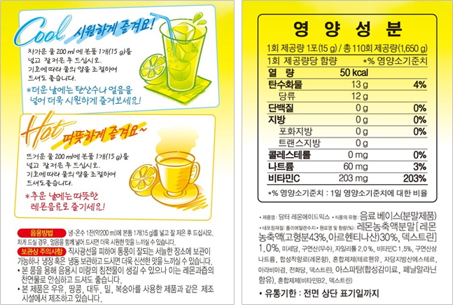 | 원재료명 및 함량 | 레몬농축액분말[레몬농축액(고형분43%,아르헨티나산)30%,덱스트린]1.0%, 미세당, 구연산(무수), 자이리톨 2.0%, 비타민C1.5%, 구연산삼나트륨, 합청착향료(레몬향), 혼합제제(테르펜유, 지당지방산에스테르, 아라비아검, 전화당, 덱스트린), 아스파탐(합성감미료, 페닐알라닌 |