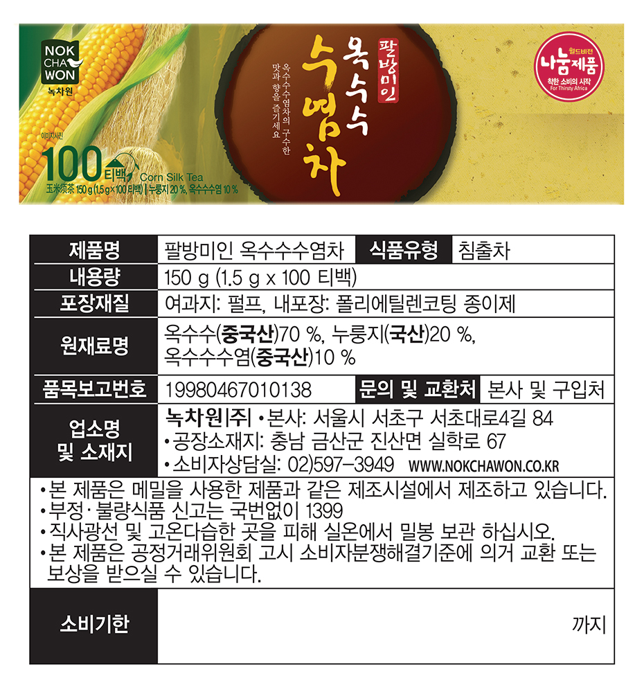| 생산자 및 소재지 (수입자) | 녹차원㈜ (본사 : 서울시 서초구 서초대로4길 84, F1(금산공장) 충남 금산군 진산면 실학로 67, F2(안성공장) 경기도 안성시 대덕면 모산로 433, F3(사천공장) 경남 사천시 곤명면 금성들길 55) |