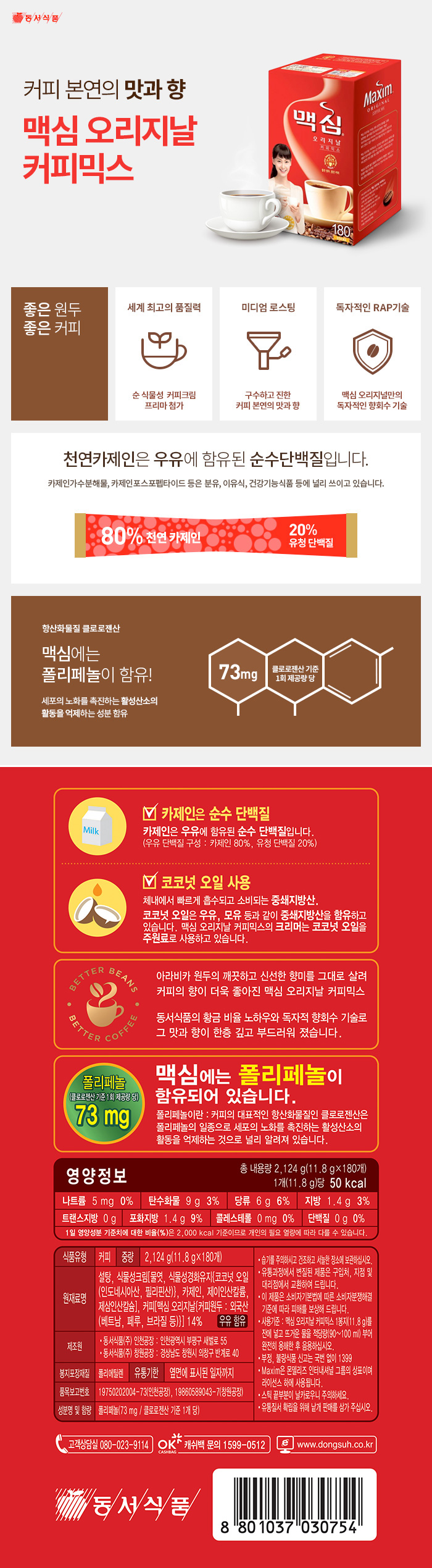 | 생산자 및 소재지 (수입자) | 동서식품/인천공장 : 인천시 부평구 청천2동 411-1, 창원공장 : 경남 창원시 의창구 팔용동 23-1 |