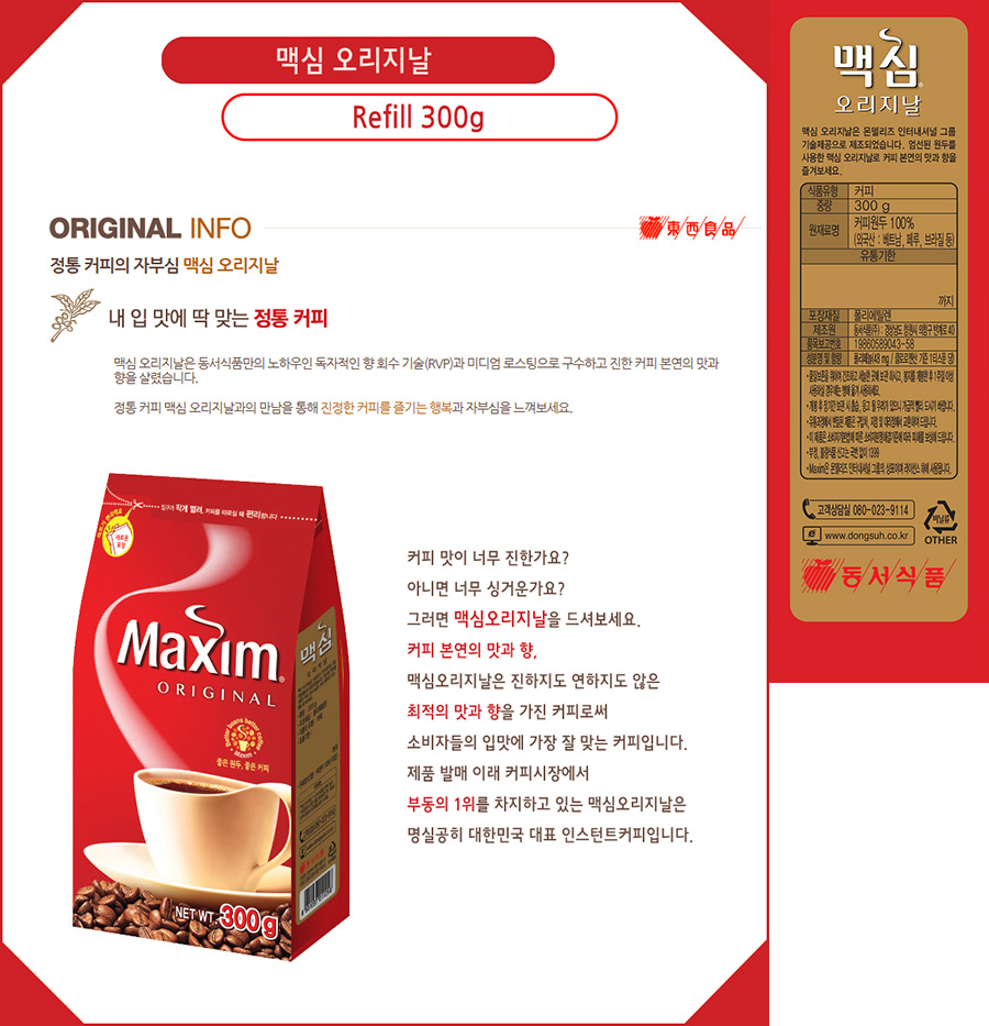 | 생산자 및 소재지 (수입자) | 동서식품/인천공장 : 인천시 부평구 청천2동 411-1, 창원공장 : 경남 창원시 의창구 팔용동 23-1 |