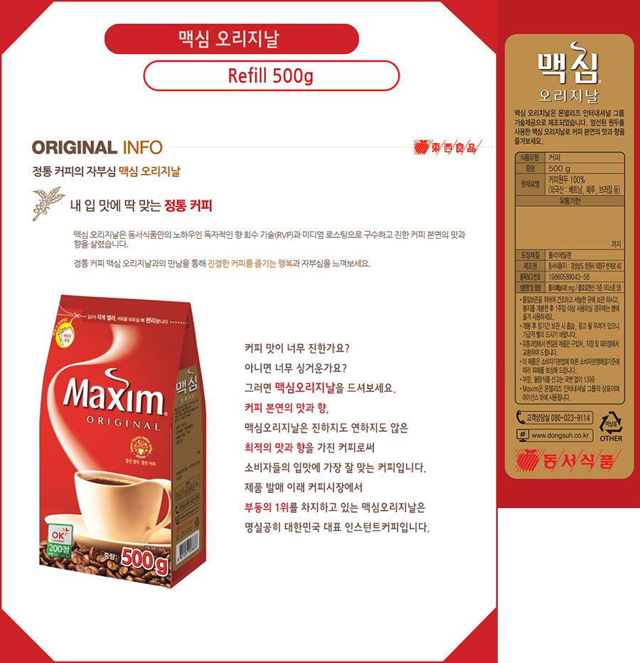 | 생산자 및 소재지 (수입자) | 동서식품/인천공장 : 인천시 부평구 청천2동 411-1, 창원공장 : 경남 창원시 의창구 팔용동 23-1 |