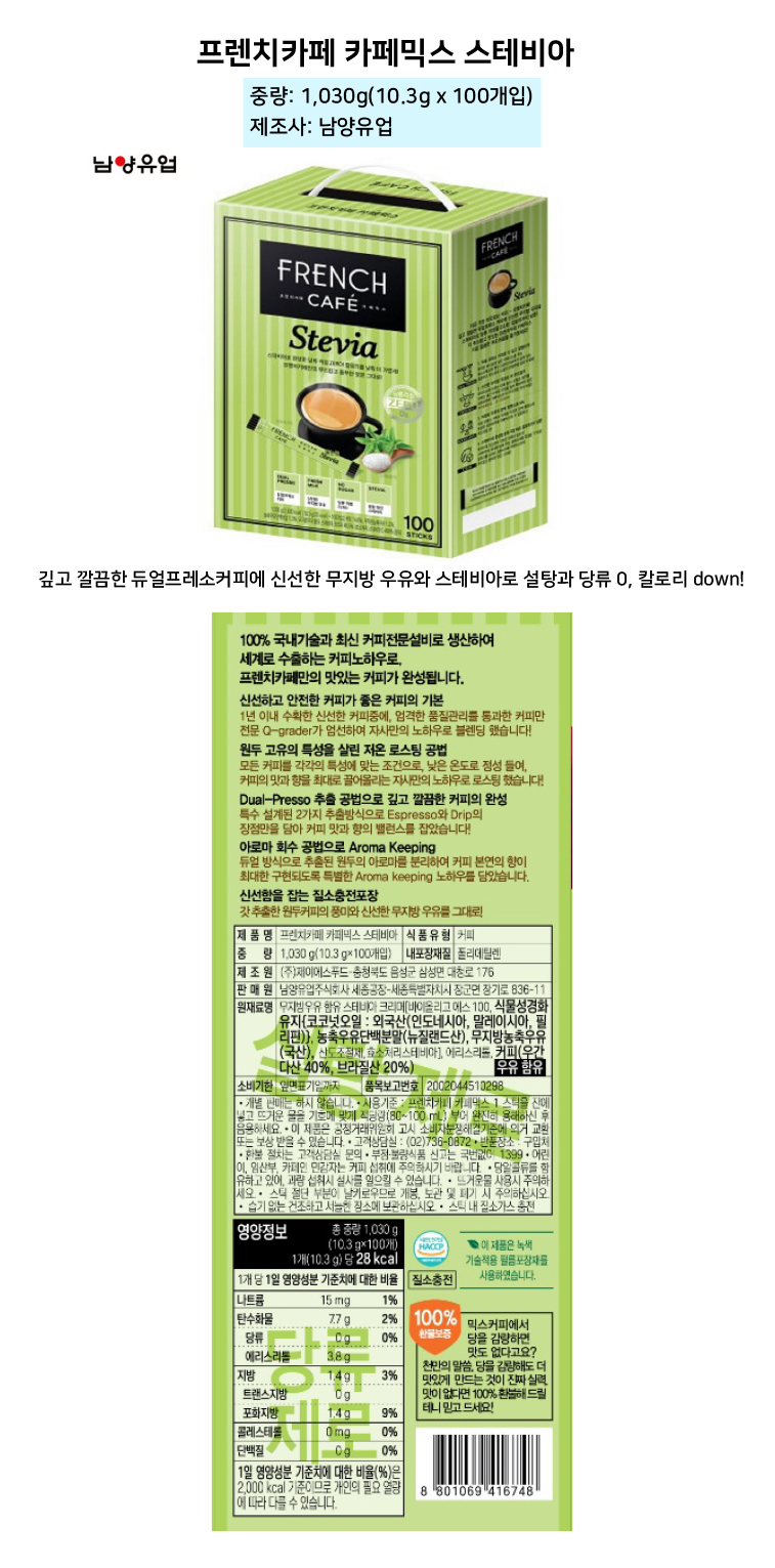 남양)프렌치카페 스테비아 커피믹스 100T