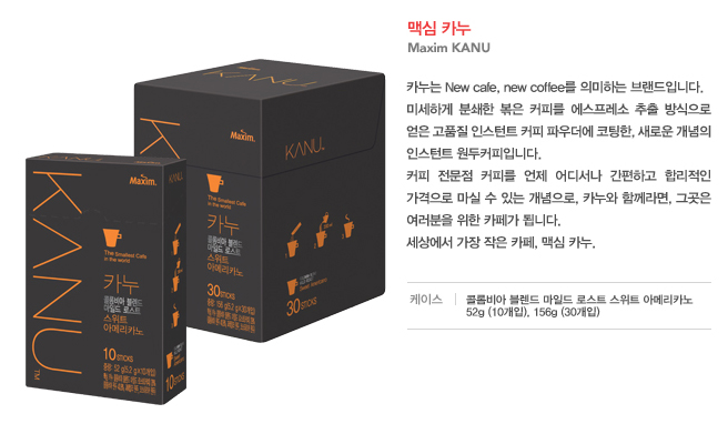 | 원재료명 및 함량 | 맥심 카누 콜롬비아 마일드 로스트 스위트(커피)29%(콜롬비아 원두 40.8%,과테말라원두,코스타리카원두),브라운 자일로스 슈거[갈색설탕, 자이로스(D-키실로오스),난소화성말토덱스트린] |