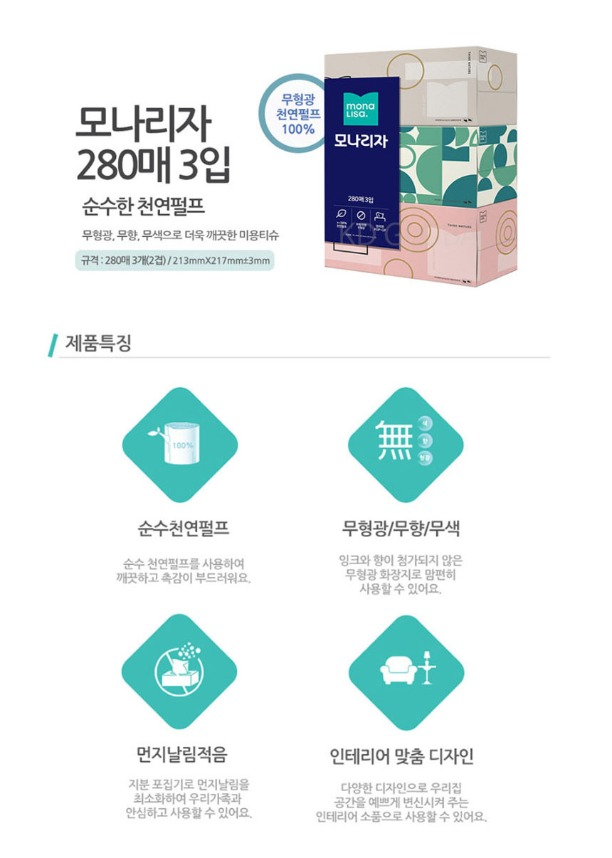 | 품명 및 모델명 | 모나리자 벨라지오 각티슈 (280매,3개/SET) |
