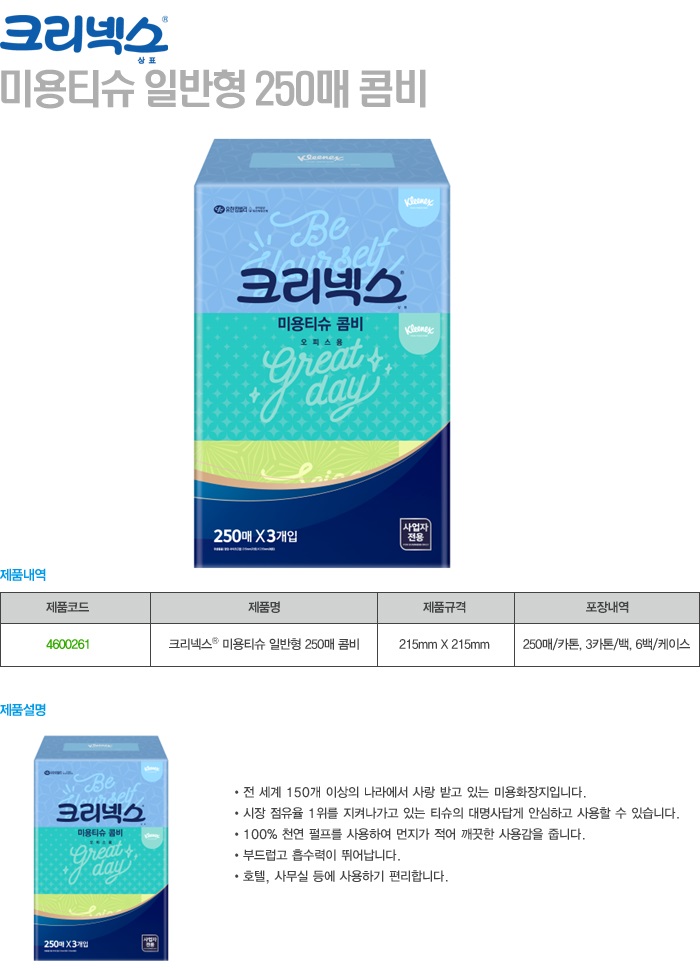 | 품명 및 모델명 | 4600261, 크리넥스® 미용티슈 250매 콤비 (6백) |