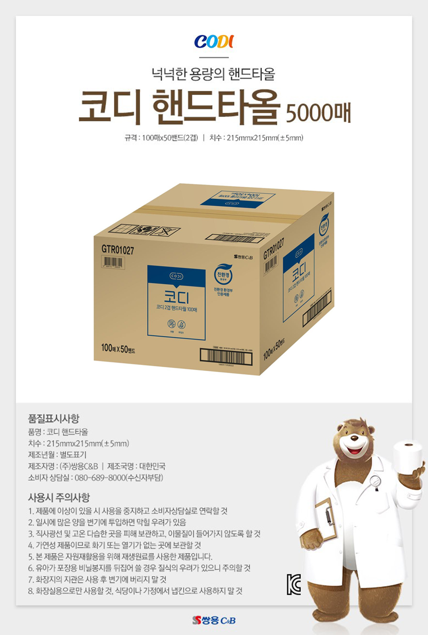 코디 핸드타올 2겹 5000매(100매*50밴드,gtr01027)