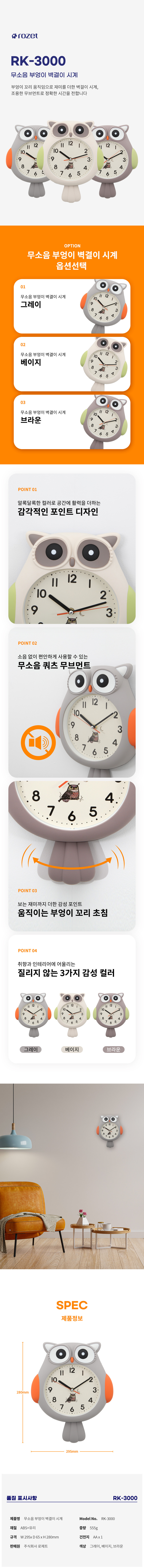 로제트 무소음 부엉이 벽결이시계 RK-3000 (그레이)