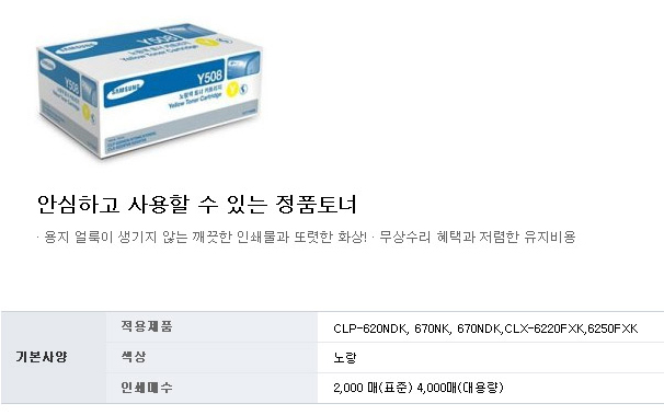 | 품명 및 모델명 | 삼성 토너 CLT-Y508S 황색 (2,000매) |