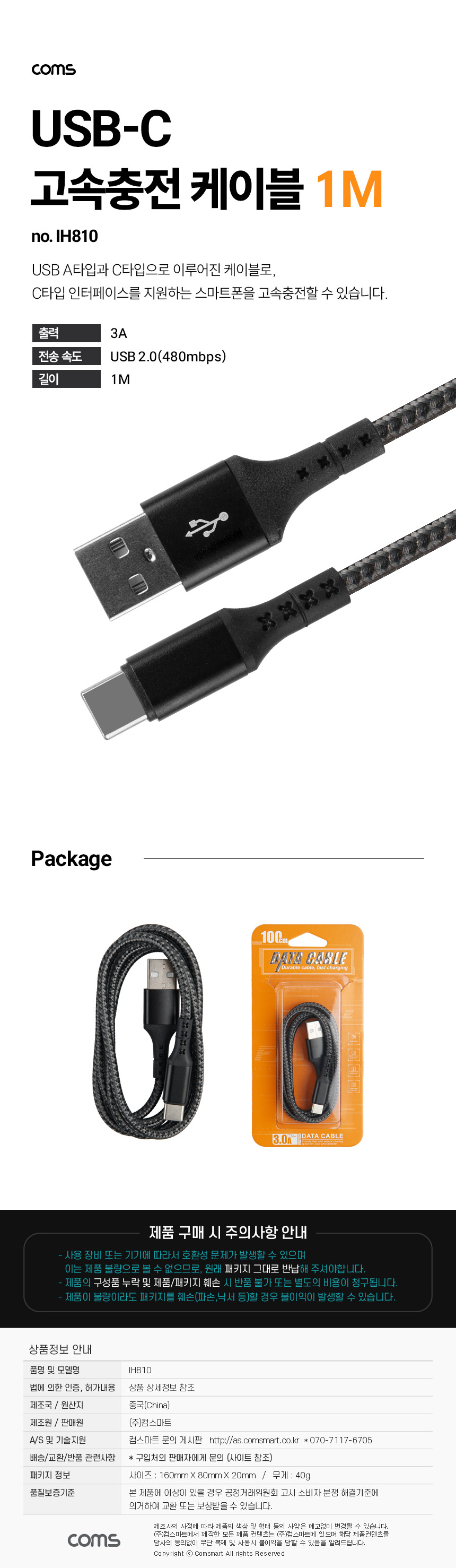 Coms)USB to C타입 고속충전케이블(IH810/3A/1M)