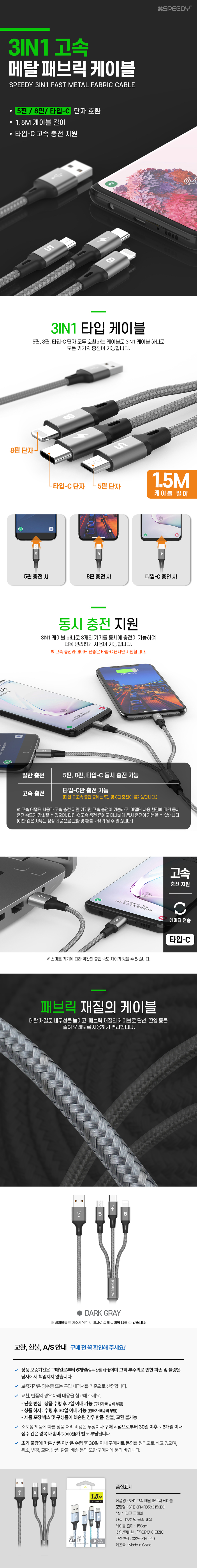 스피디)3in1 고속 메탈 패브릭 데이터 케이블 5 8 C (1.5M)