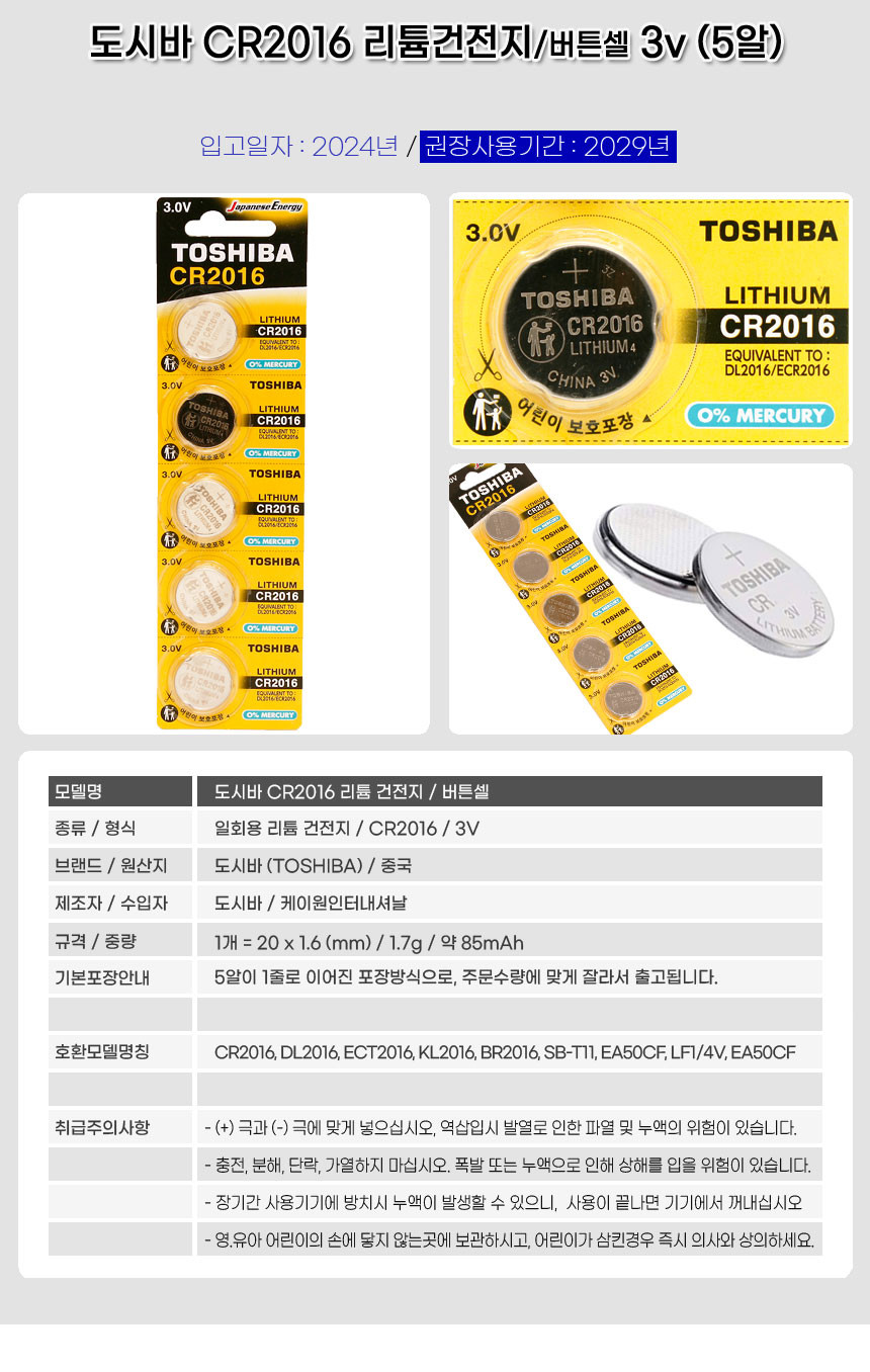 도시바 동전건전지 코인건전지 CR-2016 (5개입)