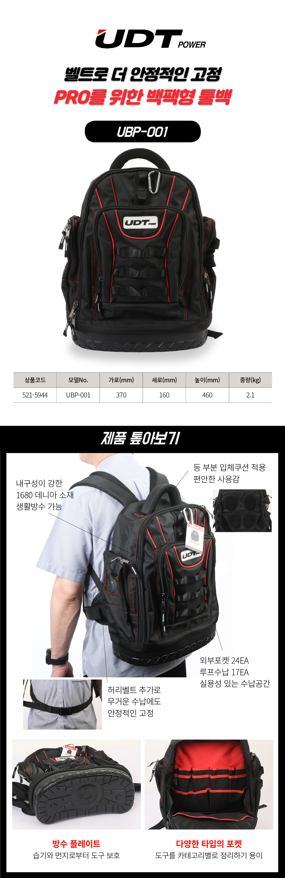 UDT 공구배낭 툴백 UBP-001 (백팩 벨트형) 외부포켓24개루프17개 370X160X460mm