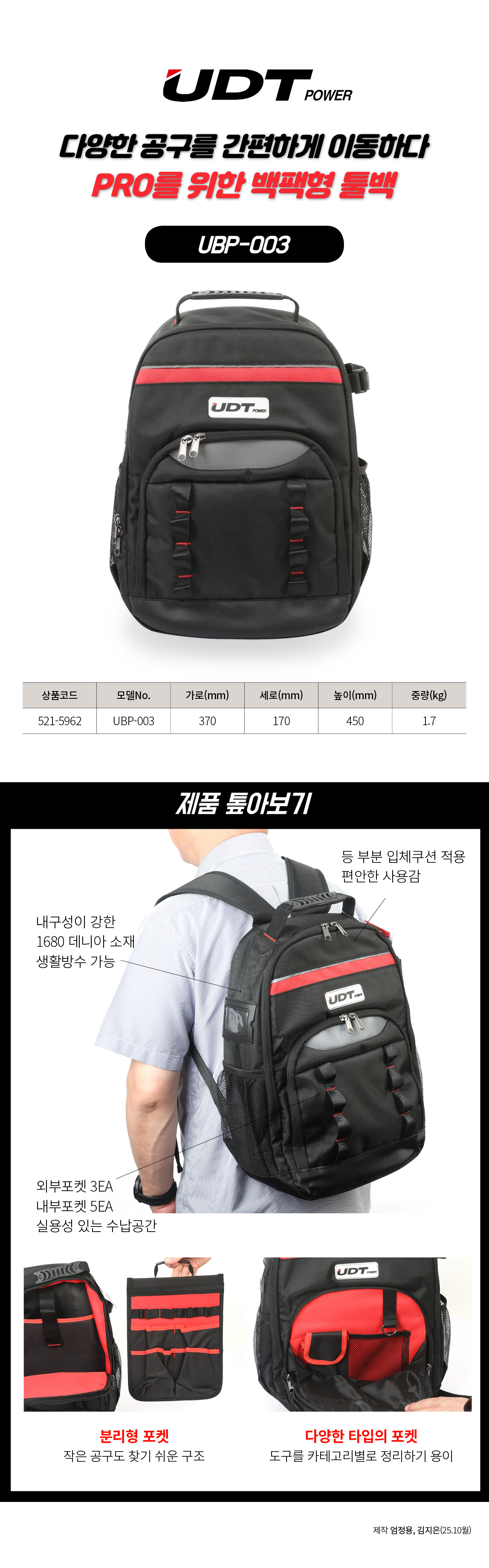 UDT 공구배날 툴백 UBP-003 (백팩) 외부포켓3개내부포켓5개 370X170X450mm